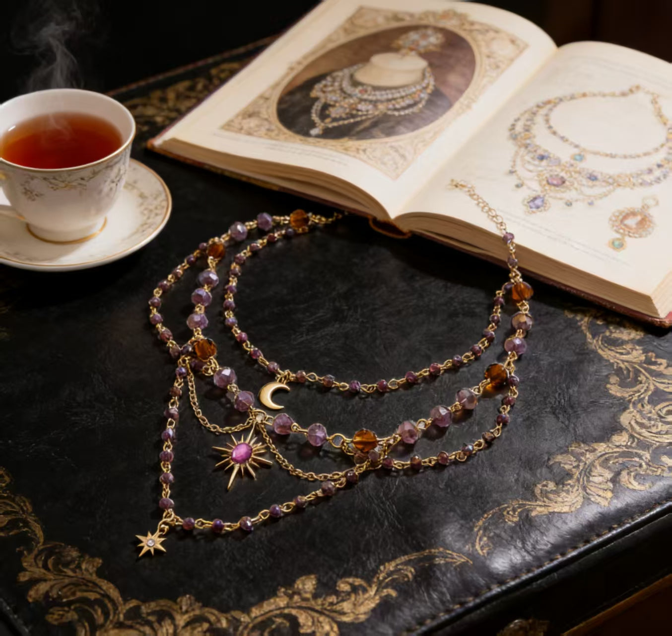 The sun-ray charm paired with a flowing tassel elongates the neckline and adds a touch of playful elegance.
