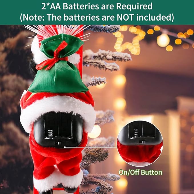 Electric animated climbing Santa Claus can climb up the ladder and go down repeatedly , wearing cheerful facial expression with a mini sack on his back.
